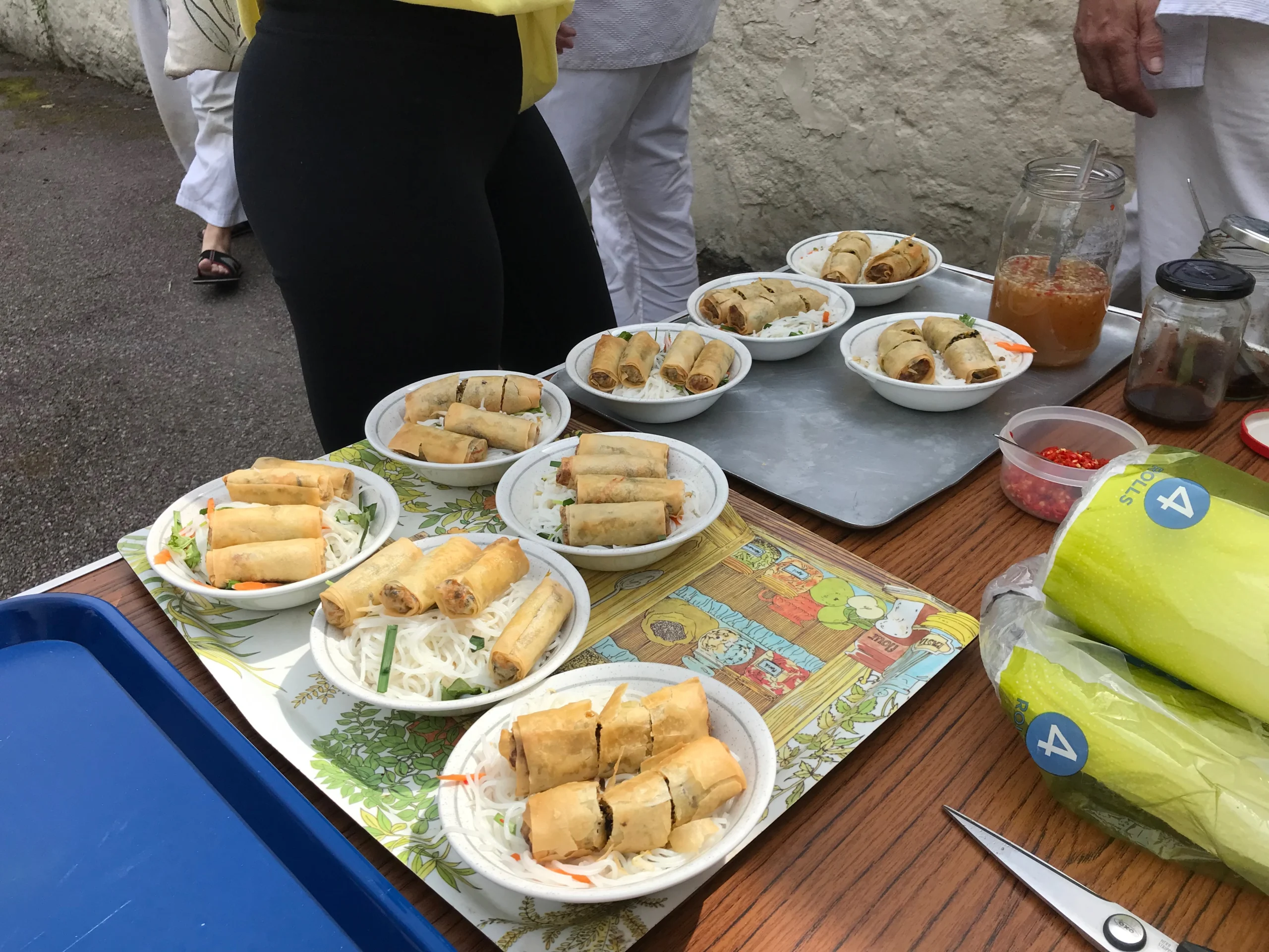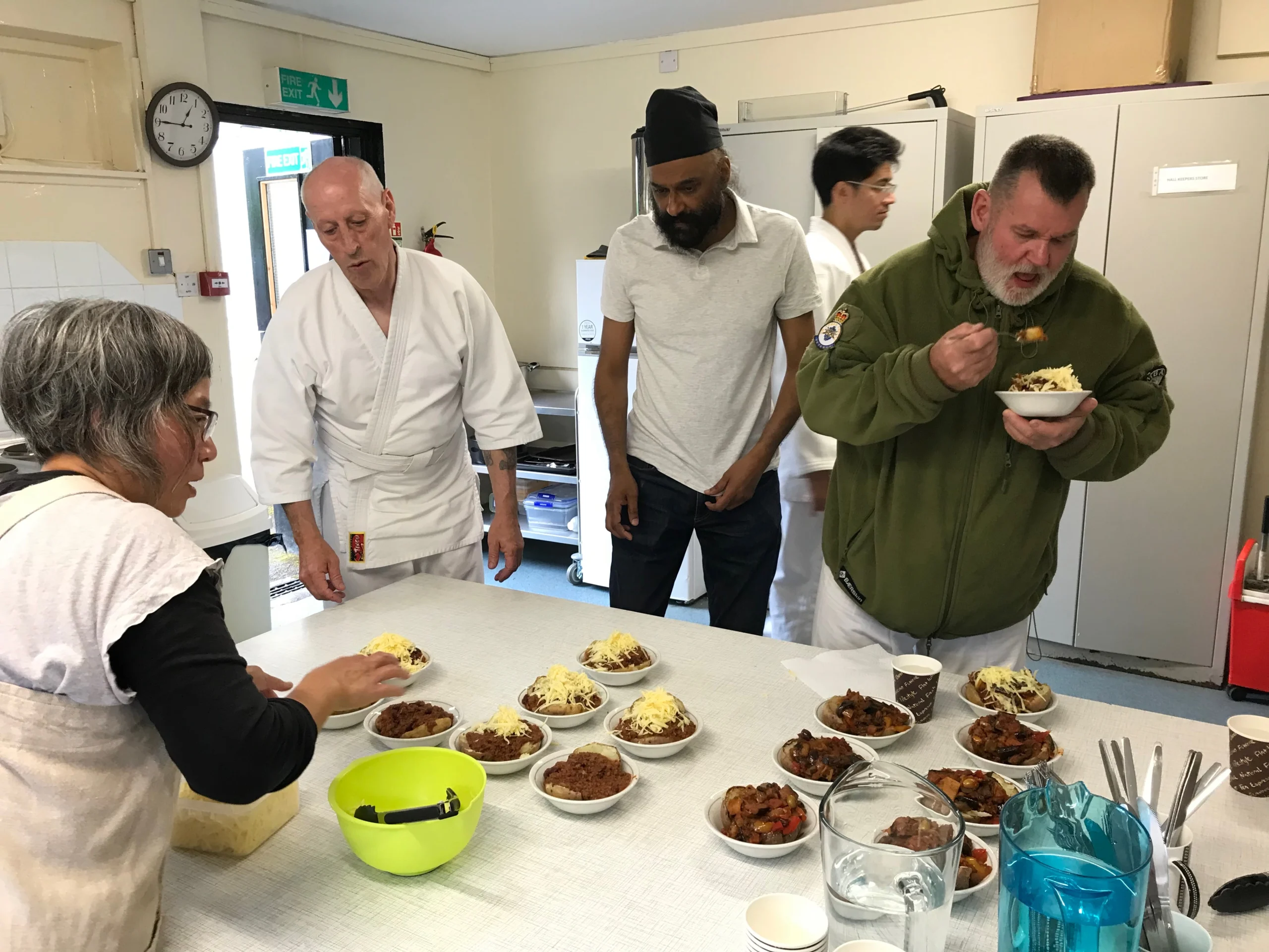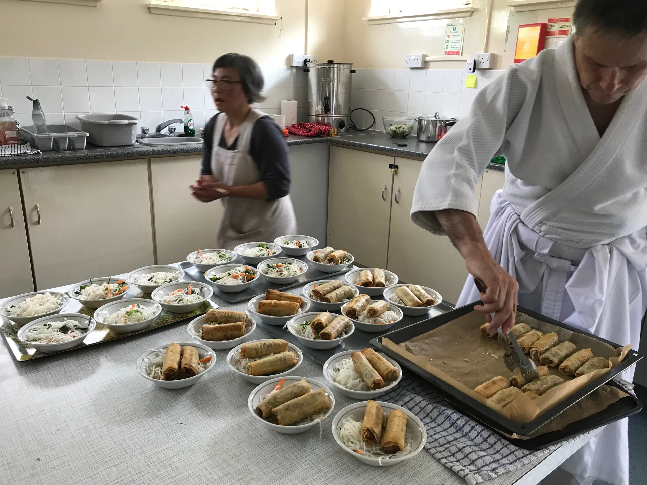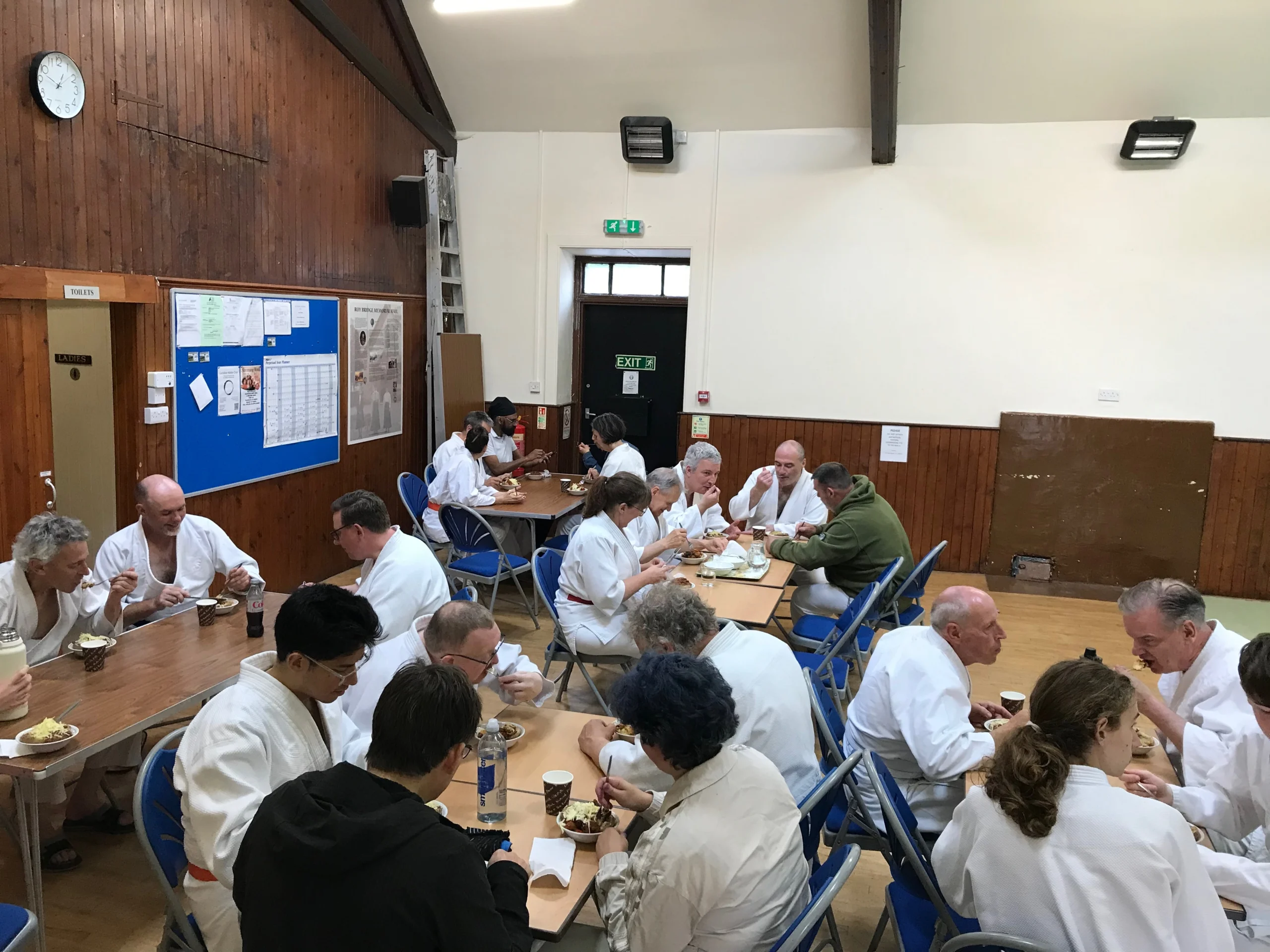 Bien sûr, il a fallu relever le défi d'assurer un approvisionnement alimentaire suffisant pour cette affluence d'aïkidoïstes affamés. Mai, notre génie culinaire résident, a donc préparé plusieurs délicieux déjeuners et une variété de gâteaux pour le goûter. Tout a été dévoré sans laisser la moindre miette. Ses efforts pour préparer le week-end à l'avance et produire les repas à temps pendant le week-end ont été récompensés par la volonté des membres visiteurs de faire le thé, de faire la vaisselle et de ranger après coup.